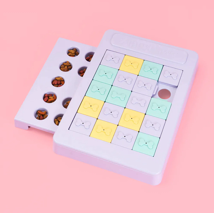 Panel Sliders feature sliding panels with raised bone designs that your dog must move to access the treats inside. Two of the panels are stationary for added difficulty. Simply pull out the tray to load with treats, slide it back in, and sit back and watch as your dog works on their problem-solving skills. Non-slip base prevents sliding.